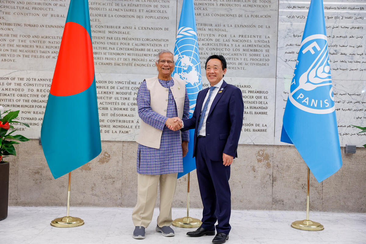 13 October 2025, Rome, Italy. FAO Director-General QU Dongyu welcomes His Excellency Muhammad Yunus, Chief Adviser of the interim Government of the People’s Republic of Bangladesh. World Food Forum (WFF) 2025. The fifth edition of the World Food Forum (WFF), the largest annual gathering of agrifood systems stakeholders globally, runs at FAO headquarters in Rome from 10 to 17 October 2025. FAO Headquarters.