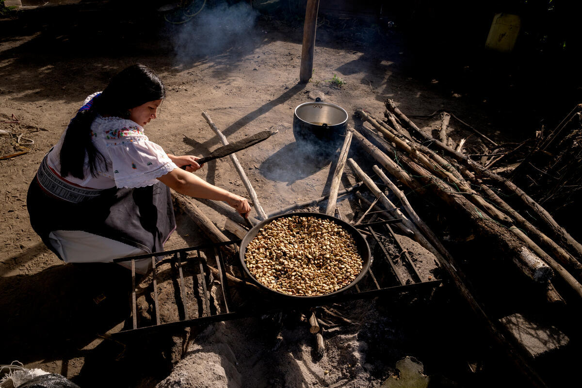 07 July 2025. Cumbas, Ecuador. María Piñan, coordinator of the Chakra Andina SIPAM project, cooks Kalpu fava beans—a traditional Andean seed—at the home of Magdalena Laime, an Ecuadorian beekeeper who preserves a wide variety of native seeds from the Ecuadorian Andes.