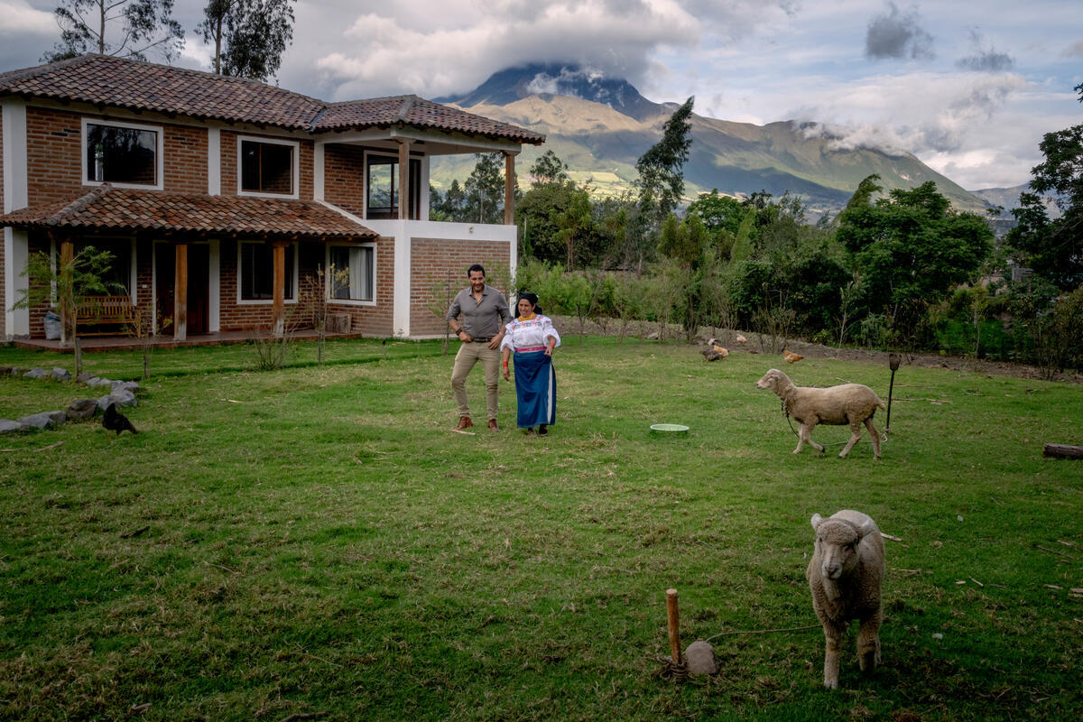 10 July 2025. Santa Bárbara, Ecuador. Luz María Alta Perugachi welcomes FAO Goodwill Ambassador Rodrigo Pacheco to her home and walks with him through the property, which operates as a community agro-tourism project. Luz María is a member of the Women’s Committee of UNORCAC (Union of Peasant and Indigenous Organizations of Cotacachi) and leads initiatives that promote traditional food systems, biodiversity, and cultural heritage. ©FAO/Johanna Alarcón. Editorial use only. Copyright ©FAO.