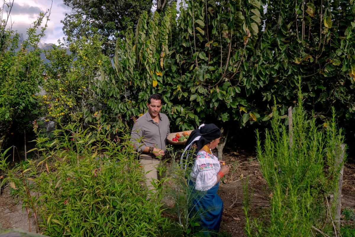 10 July 2025. Santa Bárbara, Ecuador. Rodrigo Pacheco, FAO Goodwill Ambassador (Food and Agriculture Organization of the United Nations), and Luz María Alta Perugachi, member of the UNORCAC Women’s Committee (Union of Peasant and Indigenous Organizations of Cotacachi), harvest a variety of fruits from Luz María’s garden.
