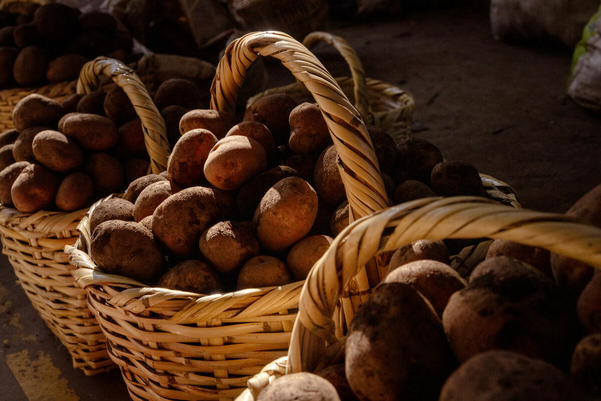 06 July 2025. Cotacachi, Ecuador. Papa chola, a variety of potato from highland areas, is displayed at the Pachamama Nos Alimenta fair, which brings together more than 150 women producers from Cotacachi.