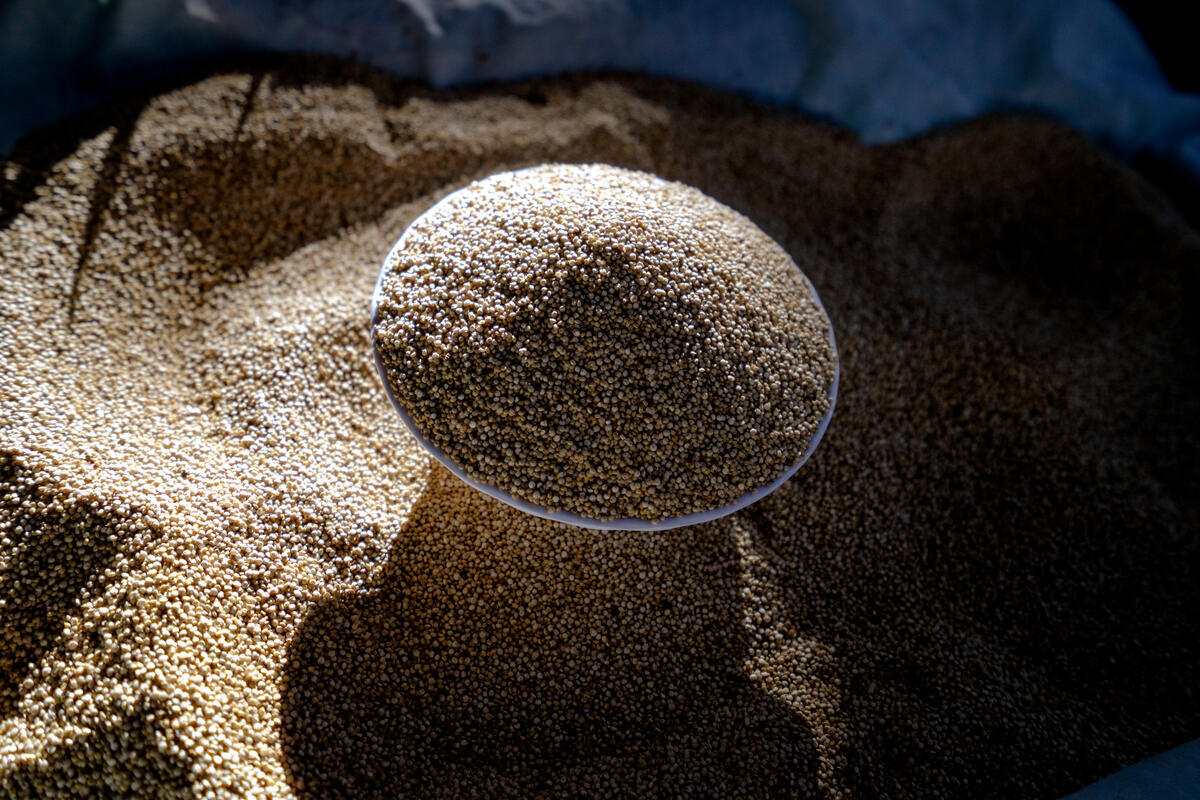 06 July 2025. Cotacachi, Ecuador. Quinoa, a grain from the high Andean region, displayed for sale at the community fair Pachamama Nos Alimenta, which brings together over 150 local women producers. Most producers own land at both high and low altitudes (2,200–2,700 meters), allowing for diversified grain production.