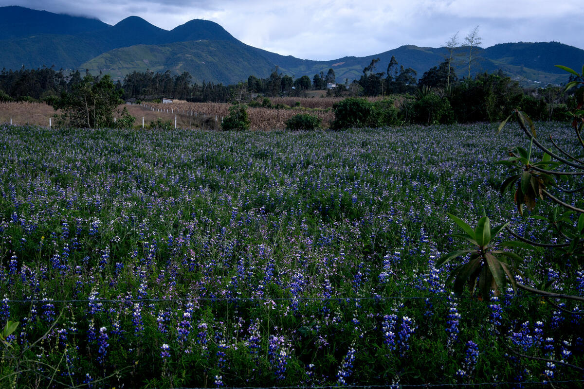 08 July 2025. Cotacachi, Ecuador. A family chakra (traditional agroecological plot) with chocho (Andean lupin) growing among other native crops. Chocho is a highly nutritious legume, rich in protein and essential for food security in the highlands.