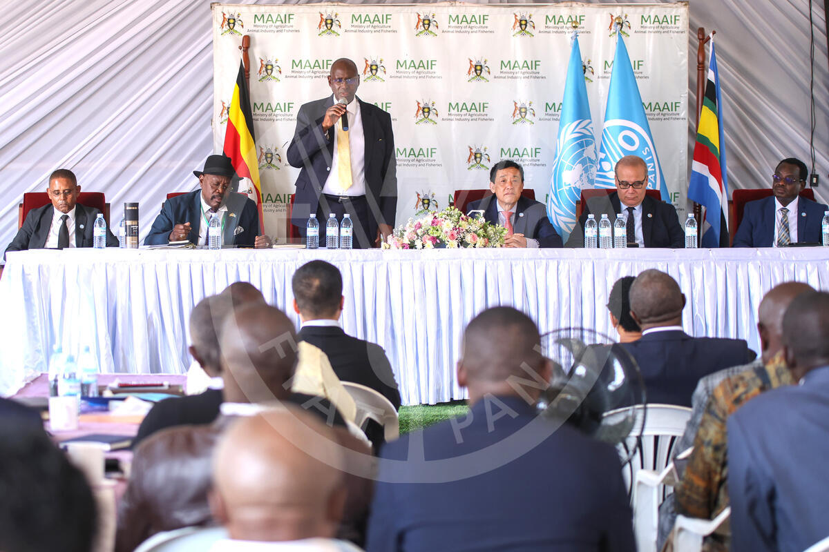 21 July 2025, Entebbe, Uganda, Hon. Bright Rwamirama, State Minister for Animal Industry, delivers his welcome remarks during a staff gathering at the Ministry of Agriculture, Animal Industry and Fisheries, organized in honour of FAO Director-General QU Dongyu’s (4th from left) official visit to Uganda.