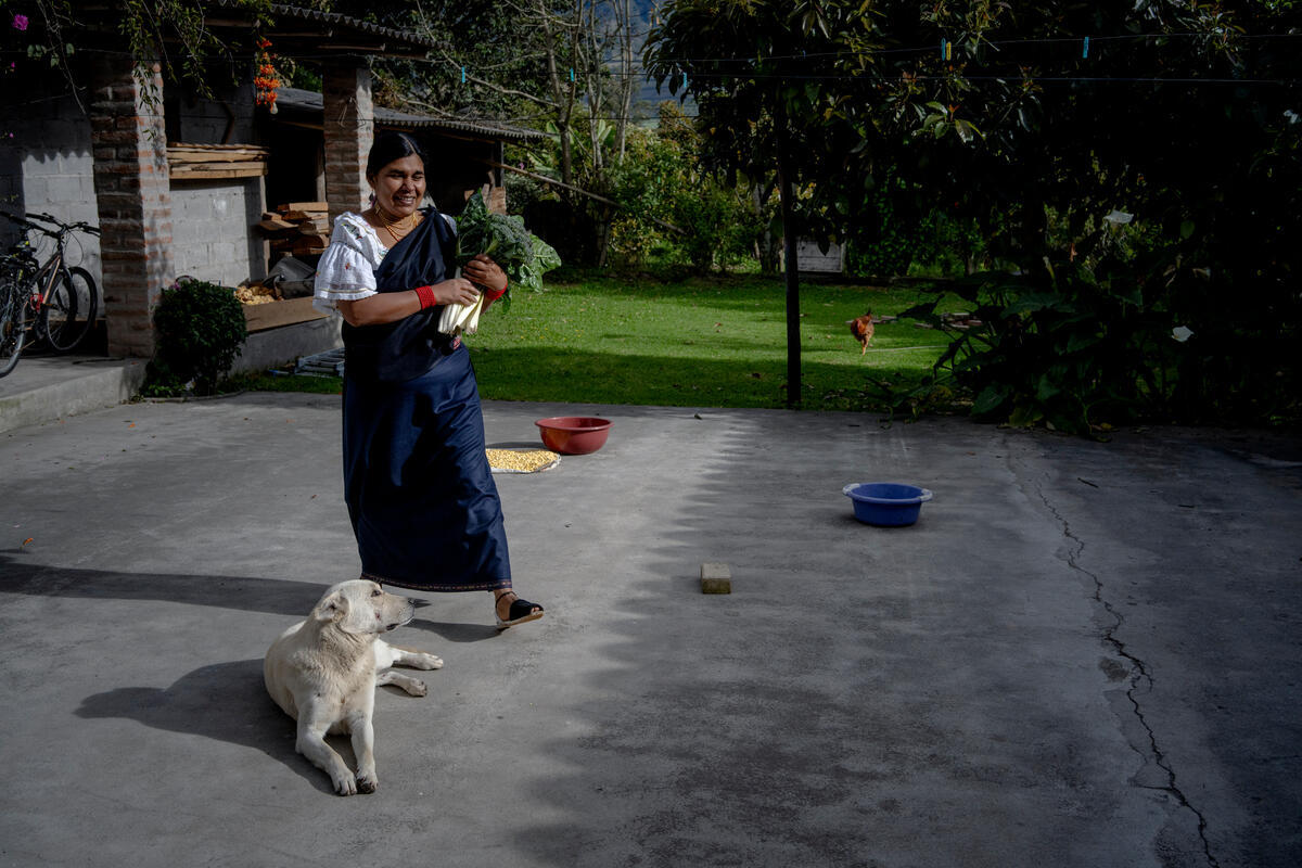 08 July 2025. Calera, Ecuador. Martha Tuquerres, the first woman president of UNORCAC (Union of Peasant and Indigenous Organizations of Cotacachi), holds Swiss chard leaves harvested from her garden. Families in the area rely on their land’s harvest as the foundation of their diet.
