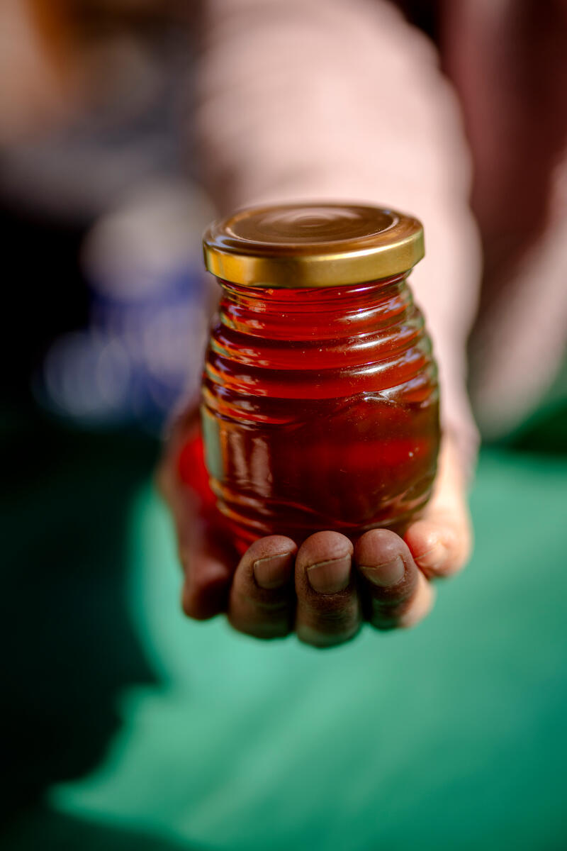 06 July 2025. Cotacachi, Ecuador. Carmen Morán holds a jar of organic honey at the Pachamama Nos Alimenta community fair, which brings together more than 150 local women producers.