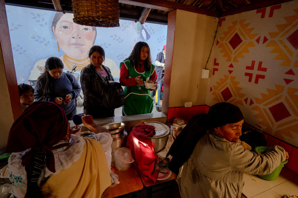 06 July 2025. Cotacachi, Ecuador. An Ecuadorian woman farmer sells menudo, a traditional dish from the Andean region made with beef offal. Each week, the women participating in the fair prepare various traditional dishes made from local ingredients to sell and trade at the community fair Pachamama Nos Alimenta. ©FAO/Johanna Alarcón. Editorial use only. Copyright ©FAO.