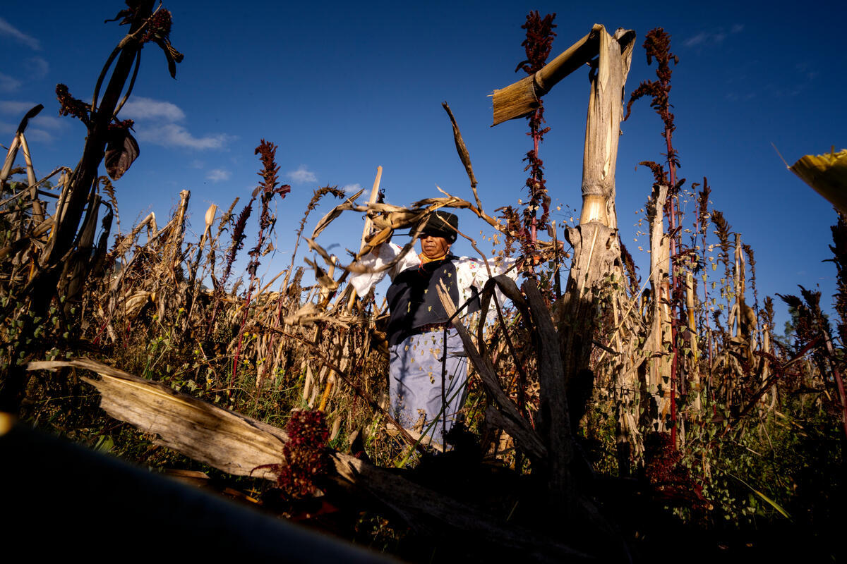 07 July 2025. Cumbas, Ecuador. Ecuadorian Kichwa farmer Magdalena Laime cuts maize stalks in her garden in the community of Cumbas, Cotacachi. She is an Indigenous woman who preserves a wide variety of native seeds from the Ecuadorian Andes.