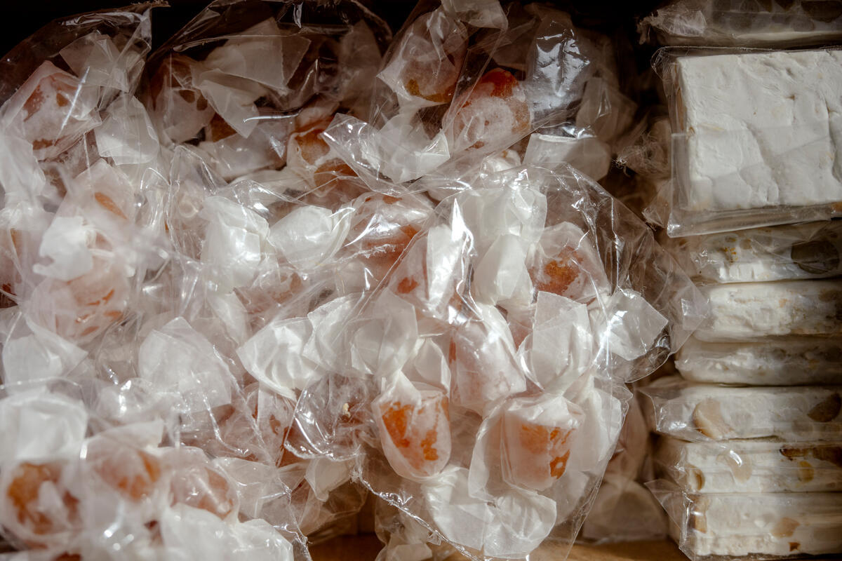 06 July 2025. Cotacachi, Ecuador. Candies and nougat made by Carmen Morán, a woman farmer who is one of the 150 women participating in the Pachamama Nos Alimenta community fair, where she sells honey, fruits, vegetables, candies, nougat, and propolis.