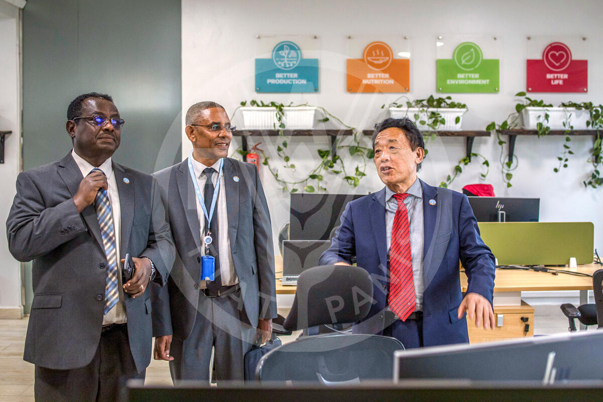 22 July 2025, Kampala, Uganda, FAO Director-General,  QU Dongyu (R), talks  next to Abebe Haile Gabriel-​​Assistant D.G / Rep. for Africa, (L) and Yergalem Beraki​​​FAO Country Rep. to Uganda, during his visit to the FAO Uganda office.