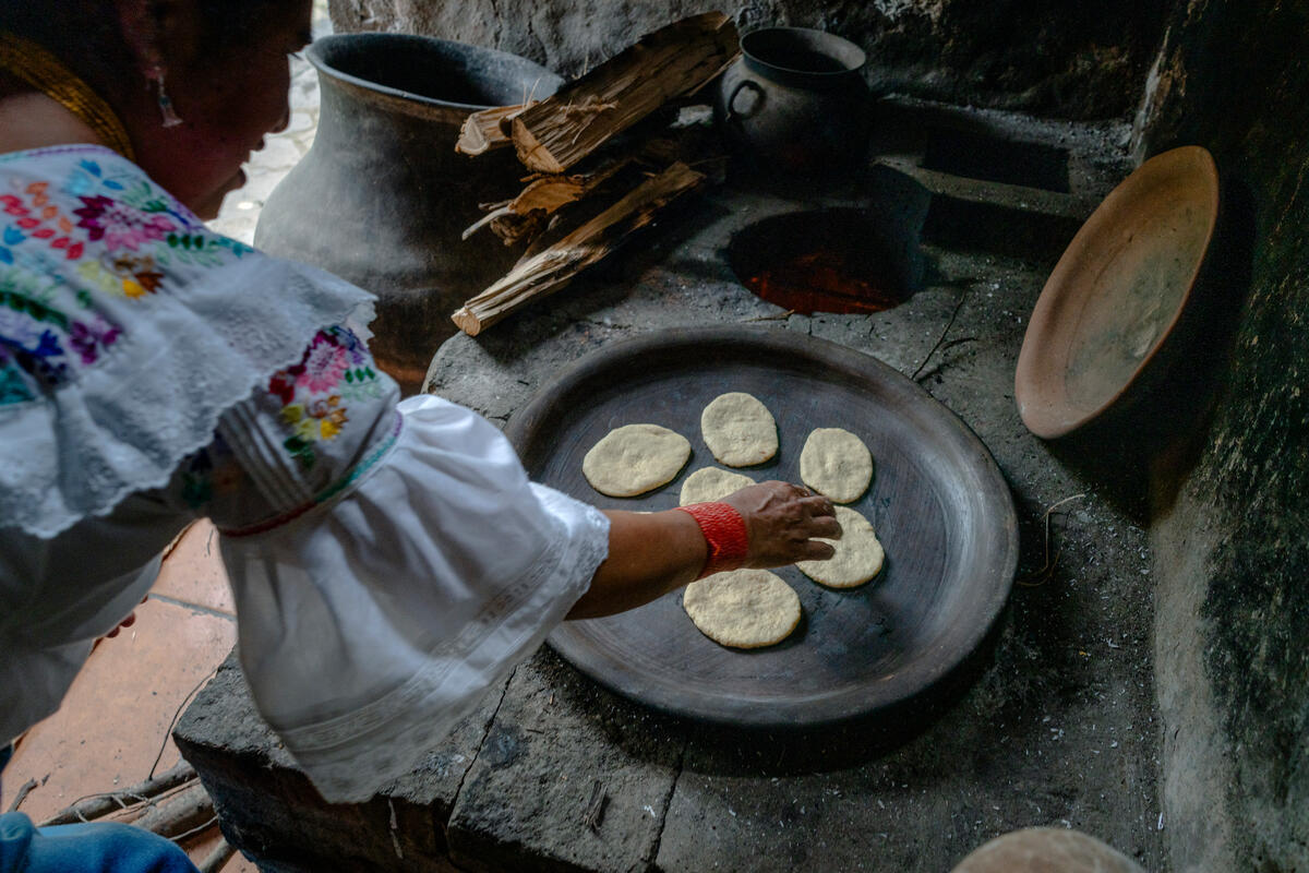 10 July 2025. Santa Bárbara, Ecuador. Luz MarĂa Alta Perugachi, member of the Women’s Committee of UNORCAC (Union of Peasant and Indigenous Organizations of Cotacachi), places maize tortillas on the tiesto, a traditional clay cooking vessel. The tortillas are made with maize flour she harvests and mills herself as part of her community-based agro-tourism and food sovereignty project.