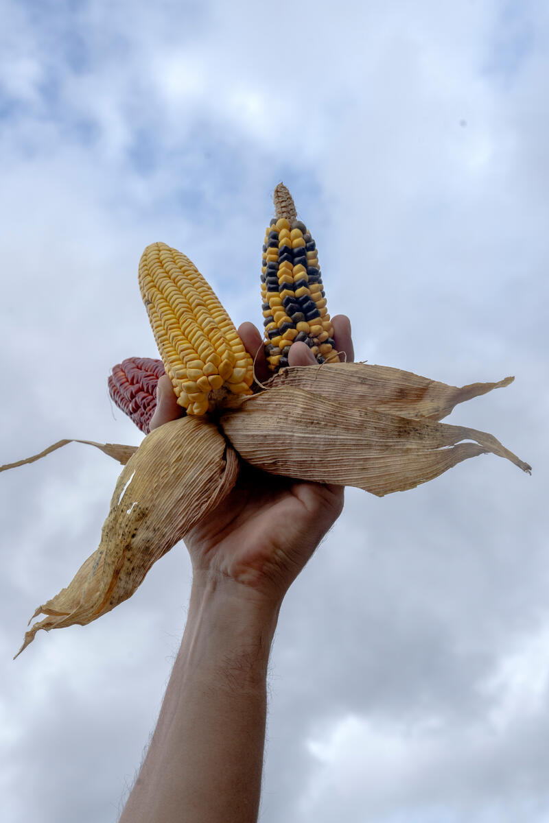 10 July 2025. Santa Bárbara, Ecuador. Rodrigo Pacheco, FAO Goodwill Ambassador (Food and Agriculture Organization of the United Nations), holds various native maize varieties cultivated in the chakras of Cotacachi.