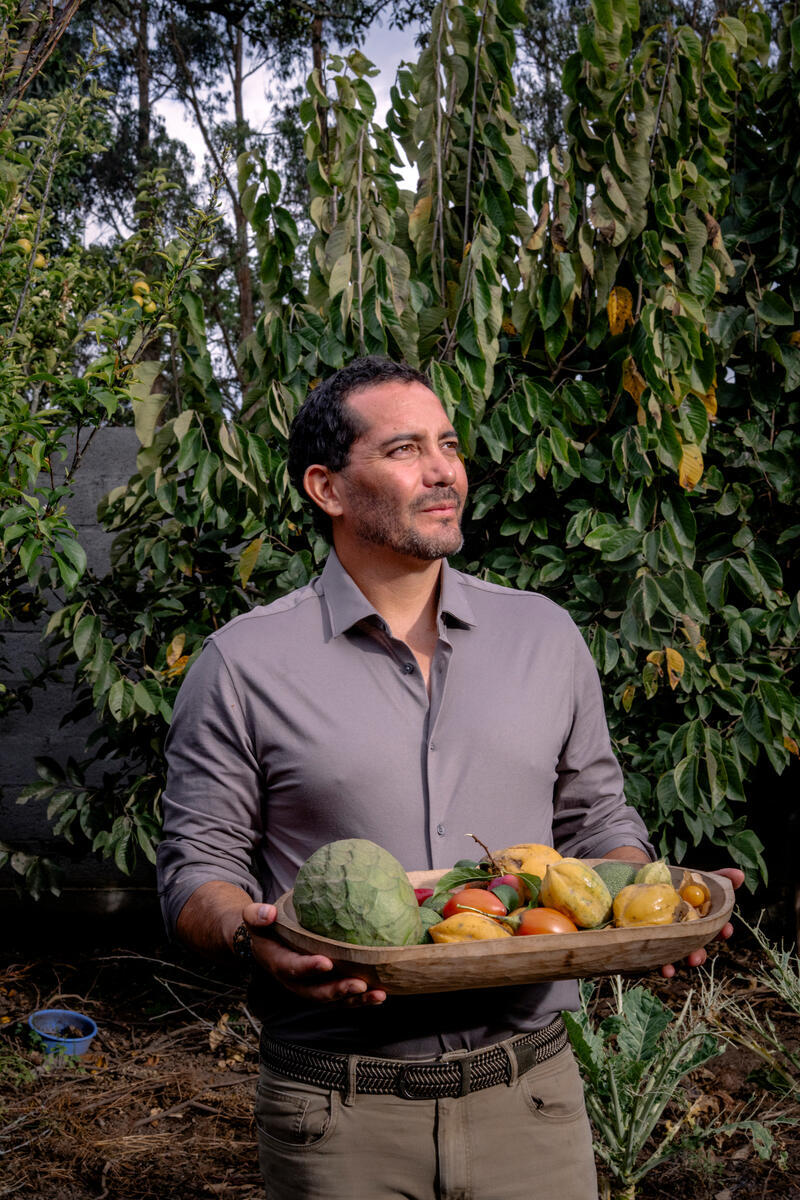 10 July 2025. Santa Bárbara, Ecuador. Chef Rodrigo Pacheco, FAO Goodwill Ambassador (Food and Agriculture Organization of the United Nations), poses for a portrait holding a basket of fruits harvested from the garden of Luz MarĂa Alta Perugachi, an Indigenous farmer and member of the UNORCAC Women’s Committee (Union of Peasant and Indigenous Organizations of Cotacachi).