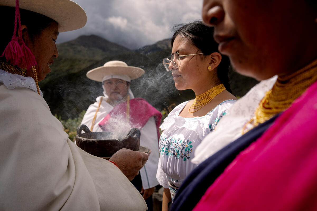 08 July 2025. Cuicocha, Ecuador. Juana Morales, member of the Ancestral Women’s Committee of UNORCAC (Union of Peasant and Indigenous Organizations of Cotacachi), spreads smoke for energetic cleansing of the women during an ancestral harvest gratitude ceremony at Cuicocha Lagoon.