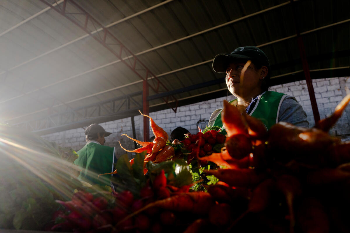 06 July 2025. Cotacachi, Ecuador. An Ecuadorian farmer displays her carrots for sale and trade at the community fair Pachamama Nos Alimenta, which brings together over 150 local women producers who offer a wide variety of fruits, vegetables, grains, bread, flours, medicinal plants, and other highly sought-after products in the region.