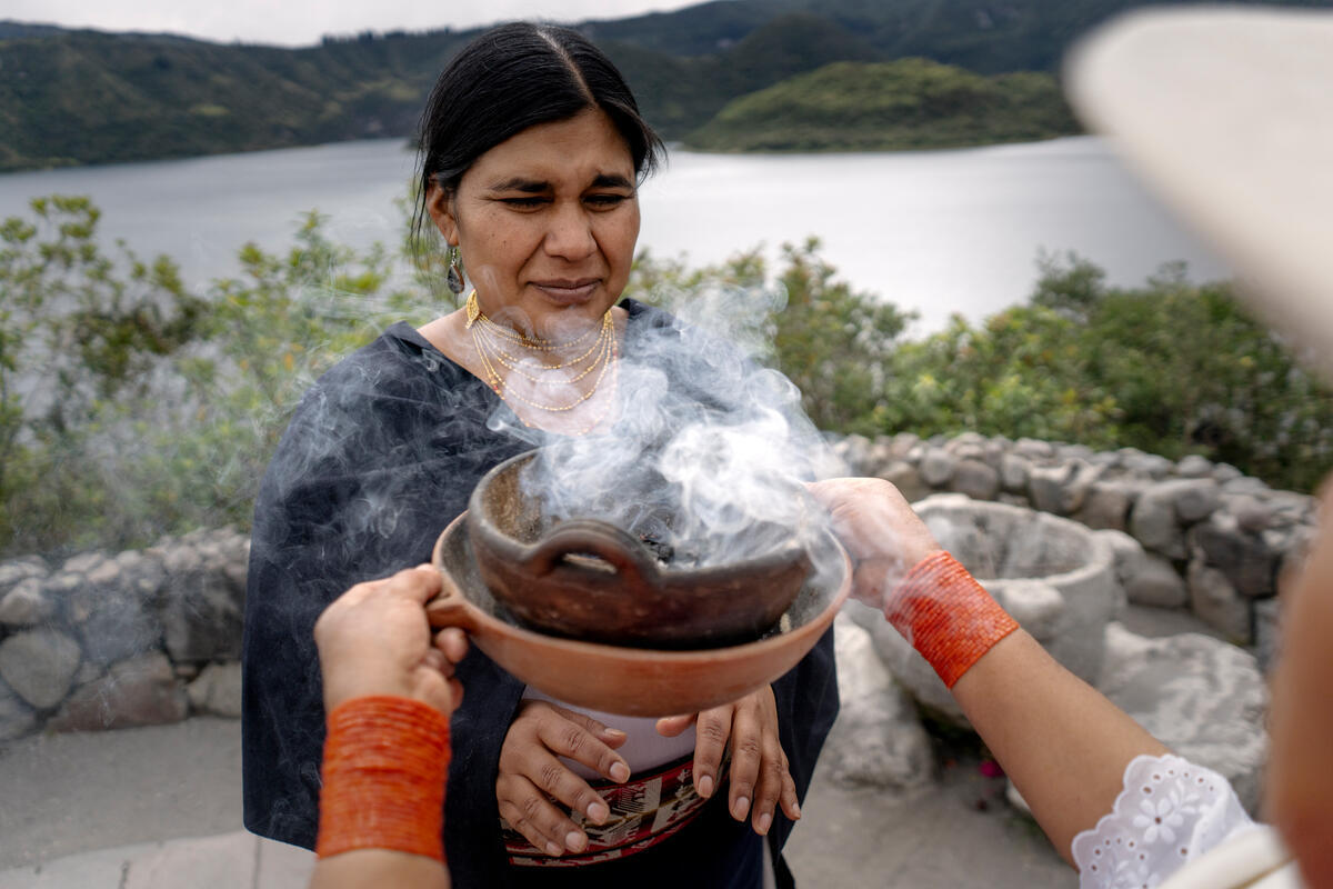 08 July 2025. Cuicocha, Ecuador. Juana Morales, member of the Ancestral Women’s Committee of UNORCAC (Union of Peasant and Indigenous Organizations of Cotacachi), performs an energetic cleansing with fire for Martha Tuquerres during an ancestral harvest gratitude ceremony at Cuicocha Lagoon.
