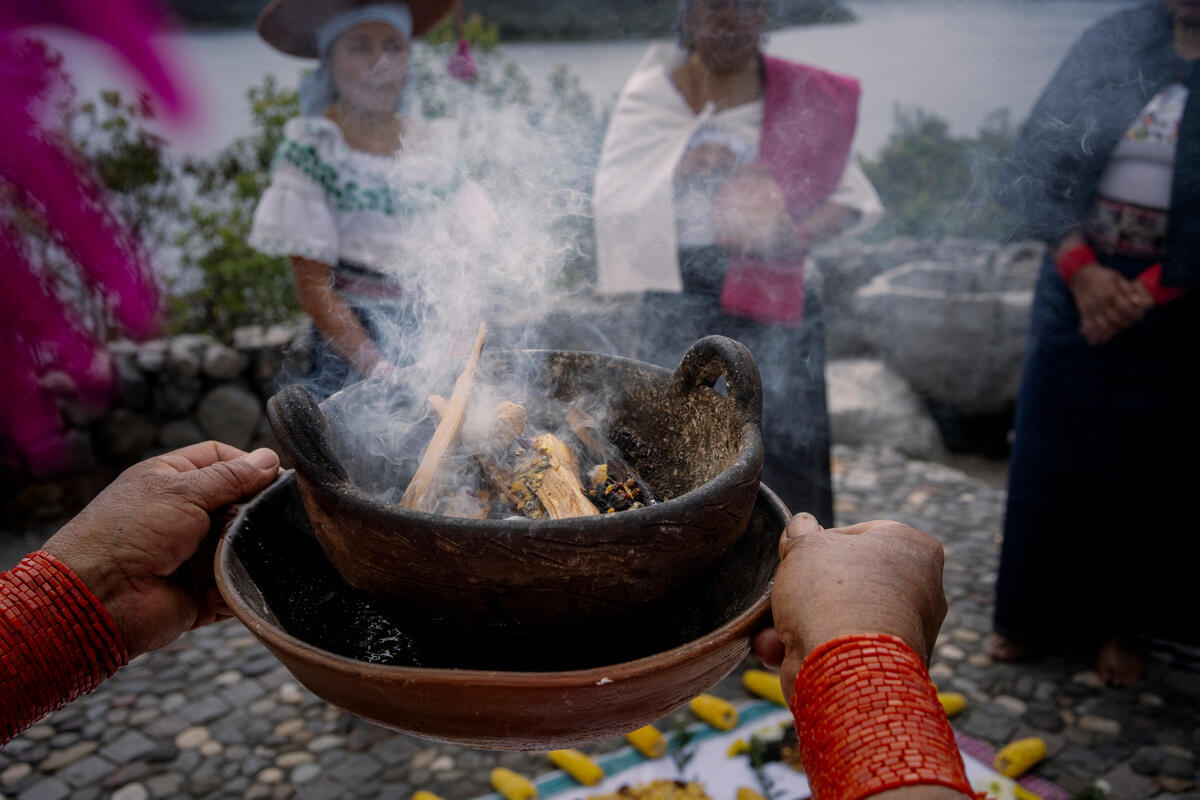 08 July 2025. Cuicocha, Ecuador. Juana Morales, member of the Ancestral Women’s Committee of UNORCAC (Union of Peasant and Indigenous Organizations of Cotacachi), holds a clay vessel with fire and palo santo during an ancestral harvest gratitude ceremony at Cuicocha Lagoon.