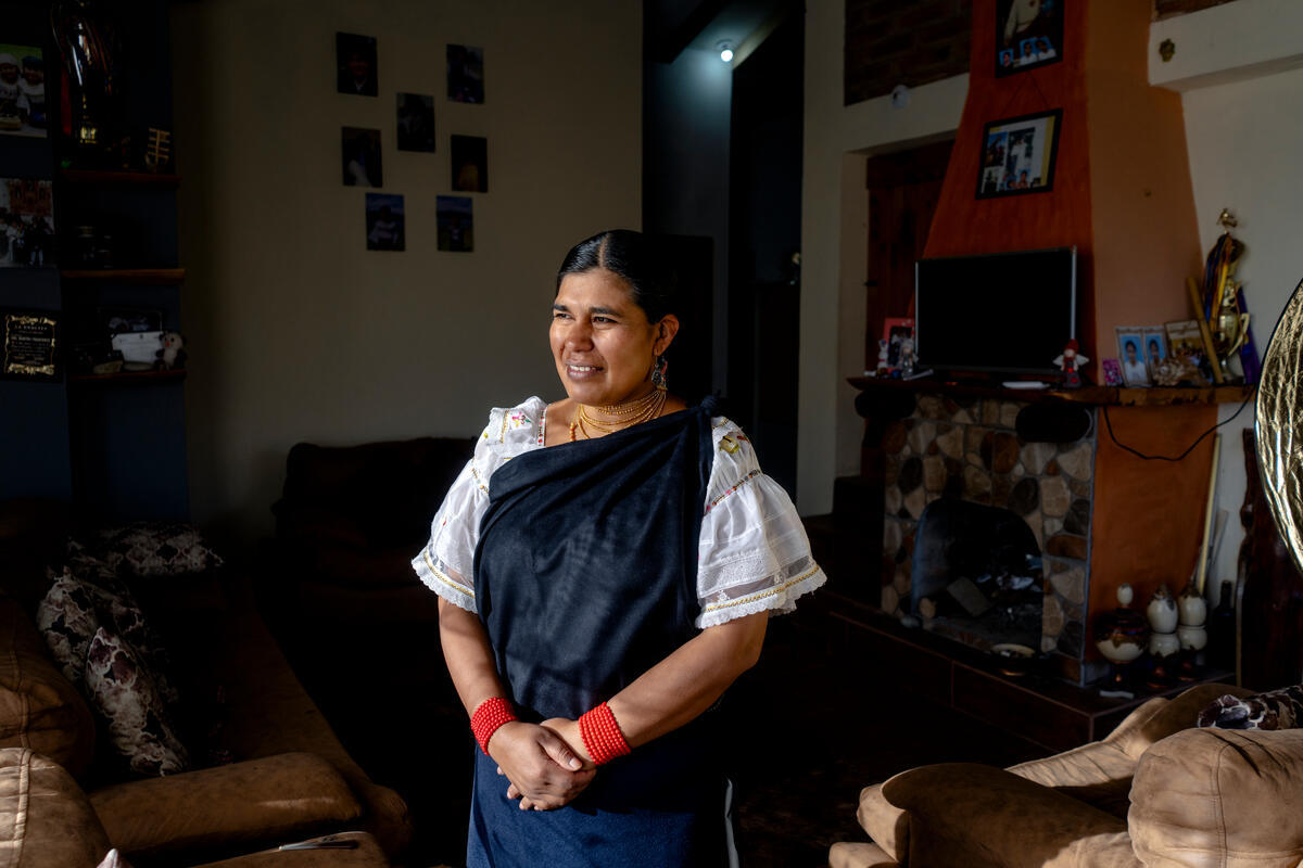 08 July 2025. Calera, Ecuador. Martha Tuquerres, the first woman president of UNORCAC (Union of Peasant and Indigenous Organizations of Cotacachi), poses for a portrait in the living room of her home. She is the first woman in her family to earn a university degree and has been part of several community and women’s organizations in Cotacachi.