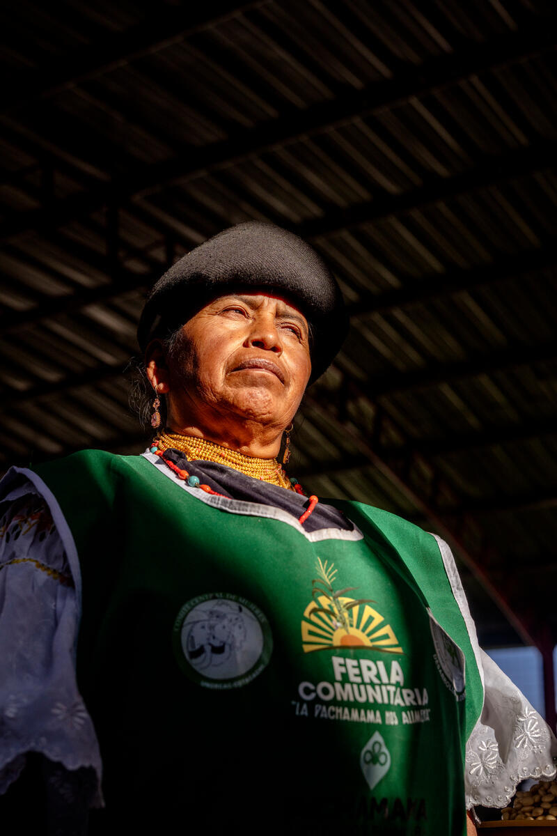 06 July 2025. Cotacachi, Ecuador. Ecuadorian farmer Magdalena Laime poses for a portrait at the community fair Pachamama Nos Alimenta. She is one of the producers with the greatest variety of native grains from the region and attends the fair each week to trade and barter her harvests.