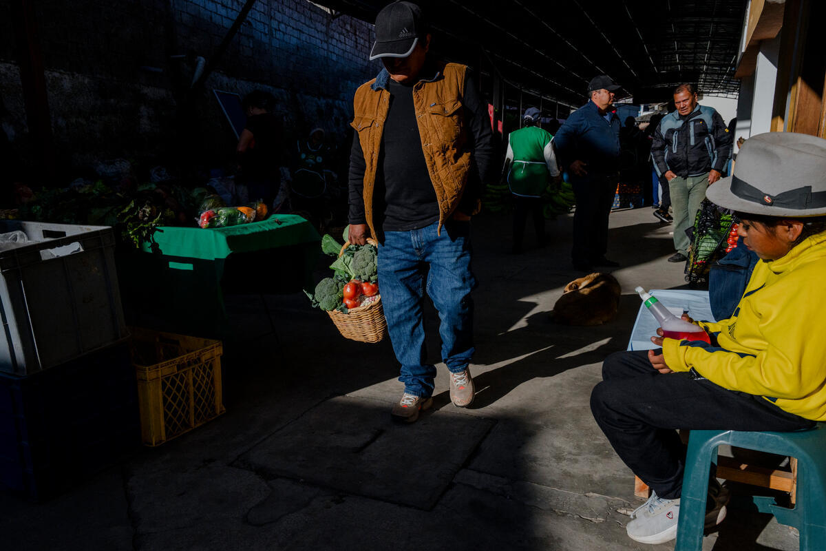 06 July 2025. Cotacachi, Ecuador. A man holds a basket filled with products purchased at the community fair Pachamama Nos Alimenta. Since early morning, hundreds of customers arrive to buy the diverse vegetables, fruits, and grains displayed by more than 150 women producers from Cotacachi.