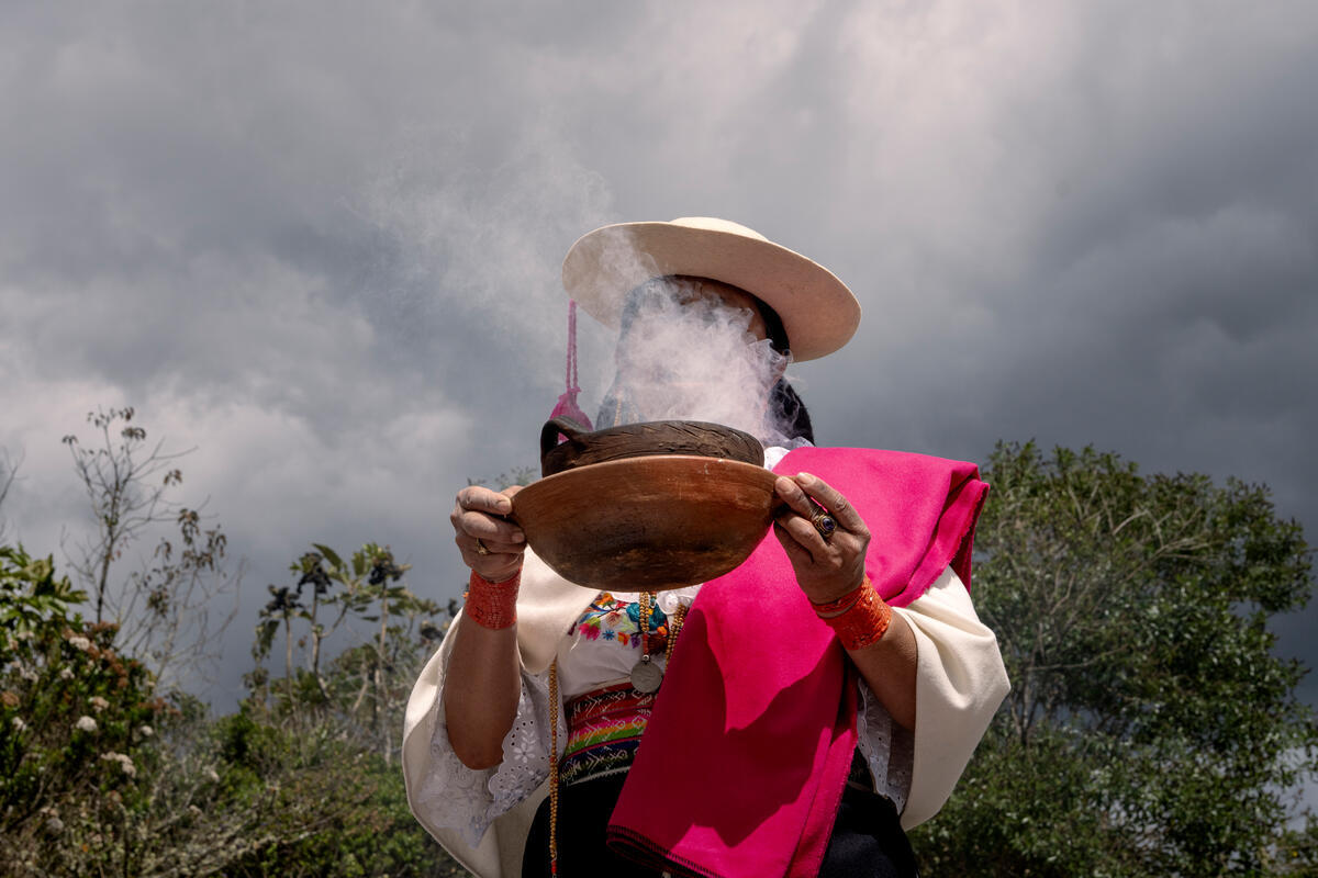 08 July 2025. Cuicocha, Ecuador. Juana Morales, member of the Ancestral Women’s Committee of UNORCAC (Union of Peasant and Indigenous Organizations of Cotacachi), holds fire during an ancestral harvest gratitude ceremony at Cuicocha Lagoon.