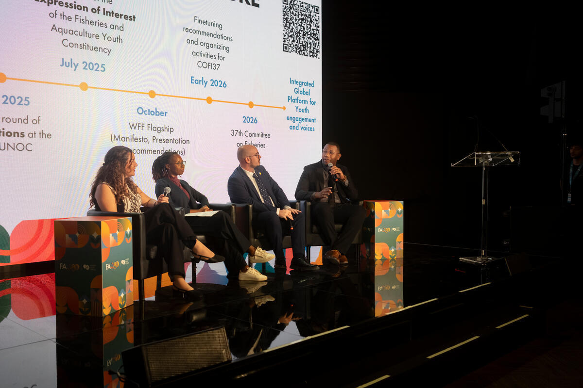 14 October 2025. FAO Headquarters, Rome, Italy. In the WFF Youth Policy Board Member, from left to right, Valeria Morales (thematic Lead for Nutrition), Tokelo Shai (thematic Lead for Bioeconomy), Alexandros Tataridas (thematic Lead for Biodiversity) and Chevaughn Brown (thematic Lead for Fisheries and Aquaculture) deliver their addresses during From Policy to Action: Youth shaping global agrifood systems
