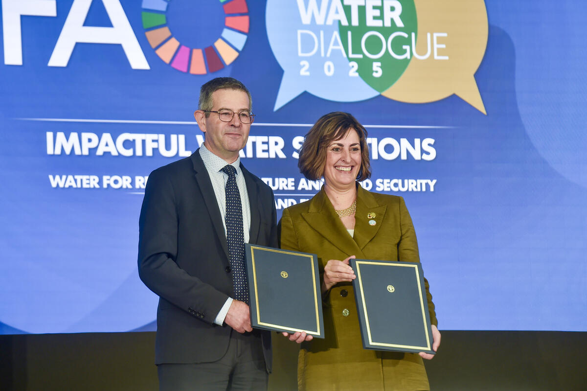 14 October, 2025. FAO Headquarters, Rome, Italy. Ms. Beth Bechdol (R), FAO Deputy Director-General, and Dr. Tardieu Eric (L), Vice President of the World Water Council, sign the Memorandum of Understanding between FAO and the International Network of Basin Organizations (INBO).