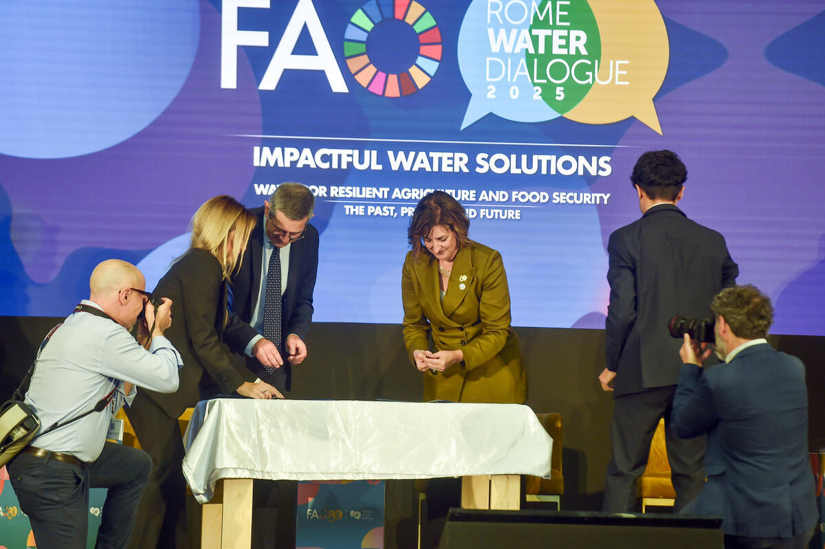 14 October, 2025. FAO Headquarters, Rome, Italy. Ms. Beth Bechdol (R), FAO Deputy Director-General, and Dr. Tardieu Eric (L), Vice President of the World Water Council, sign the Memorandum of Understanding between FAO and the International Network of Basin Organizations (INBO).