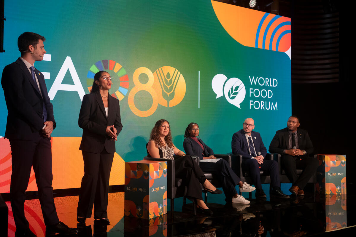 14 October 2025. FAO Headquarters, Rome, Italy. In the WFF Youth Policy Board Member, from left to right, the two moderators Andrea Granata and Zineb Amine, with the speakers Valeria Morales (thematic Lead for Nutrition), Tokelo Shai (thematic Lead for Bioeconomy), Alexandros Tataridas (thematic Lead for Biodiversity) and Chevaughn Brown (thematic Lead for Fisheries and Aquaculture) during From Policy to Action: Youth shaping global agrifood systems.