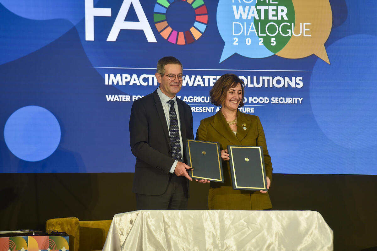 14 October, 2025. FAO Headquarters, Rome, Italy. Ms. Beth Bechdol (R), FAO Deputy Director-General, and Dr. Tardieu Eric (L), Vice President of the World Water Council, hold the Memorandum of Understanding between FAO and the International Network of Basin Organizations (INBO).