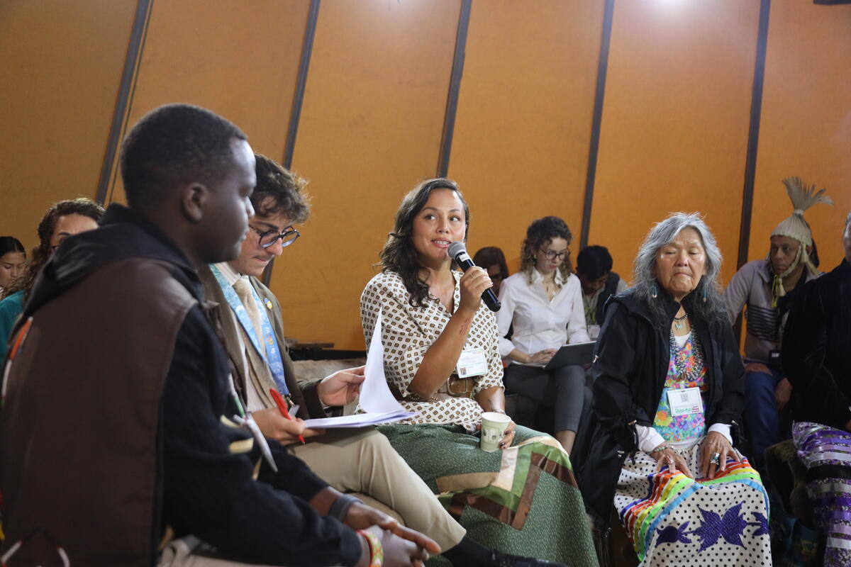 14 October 2025. FAO Headquarters, Rome, Italy. Brooke Rice, founder of Tka:nios project (C), speaks at the Indigenous Youth and Intergenerational transmission of knowledge.