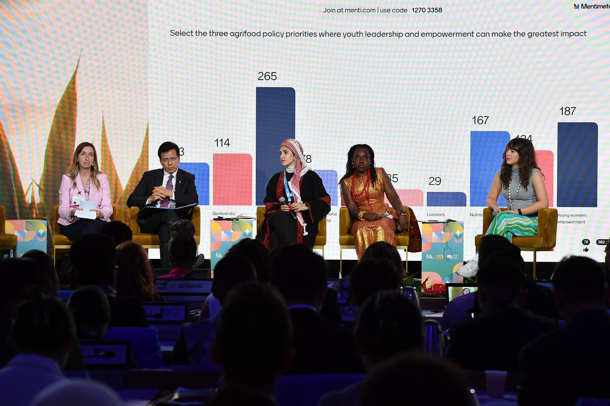 rom left to right: Nicoletta Merlo, Head of Youth Policies at CISL; His Excellency Lok Bahadur Thapa, President of the 2026 session of the Economic and Social Council; Rand Alkhushman, Board Member of the WFF Youth Policy; Alberta Nana Akyaa Akosa, Founder of Agrihouse Foundation and Leader of WFF Ghana; Natasja Holscher, UN Youth Representative Biodiversity and Food, attend the Global Youth Forum Opening Ceremony at World Food Forum 2025.