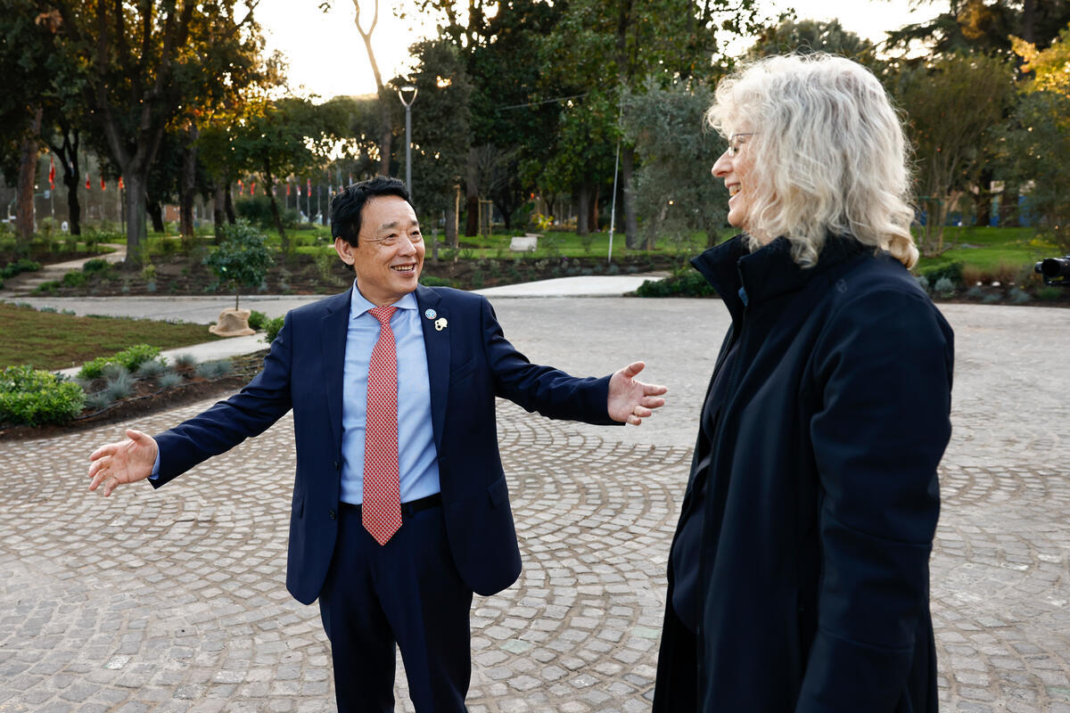 14 October 2025. FAO Headquarters, Rome, Italy. FAO Director-General QU Dongyu (L) and Tina Mittendorf, Head of the Infrastructure and Facilities Management Service (CSLI), pictured before the inauguration of the Asian Pavilions during the World Food Forum 2025. The fifth edition of the World Food Forum (WFF), the largest annual gathering of agrifood systems stakeholders globally, takes place at FAO Headquarters in Rome from 10 to 17 October 2025.