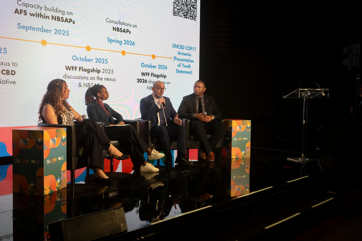 14 October 2025. FAO Headquarters, Rome, Italy. In the WFF Youth Policy Board Member, from left to right, Valeria Morales (thematic Lead for Nutrition), Tokelo Shai (thematic Lead for Bioeconomy), Alexandros Tataridas (thematic Lead for Biodiversity) and Chevaughn Brown (thematic Lead for Fisheries and Aquaculture) deliver their addresses during From Policy to Action: Youth shaping global agrifood systems