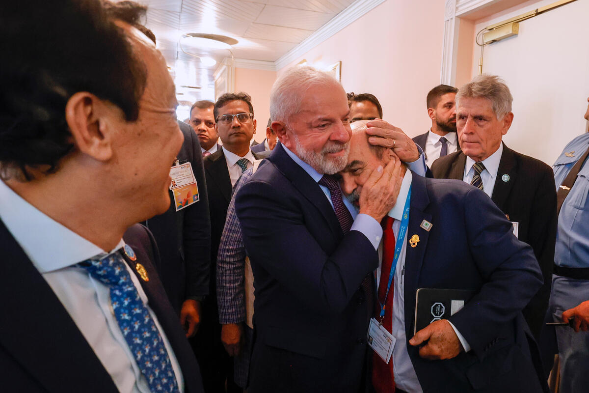 13 October 2025, Rome, Italy. Luiz Inácio Lula da Silva, President of Brazil, holds former FAO Director-General José Graziano da Silva, as FAO Director-General QU Dongyu (L). looks on at the end of the World Food Forum (WFF) 2025 Grand Opening. The fifth edition of the World Food Forum (WFF), the largest annual gathering of agrifood systems stakeholders globally, runs at FAO headquarters in Rome from 10 to 17 October 2025. FAO Headquarters (Plenary Hall).