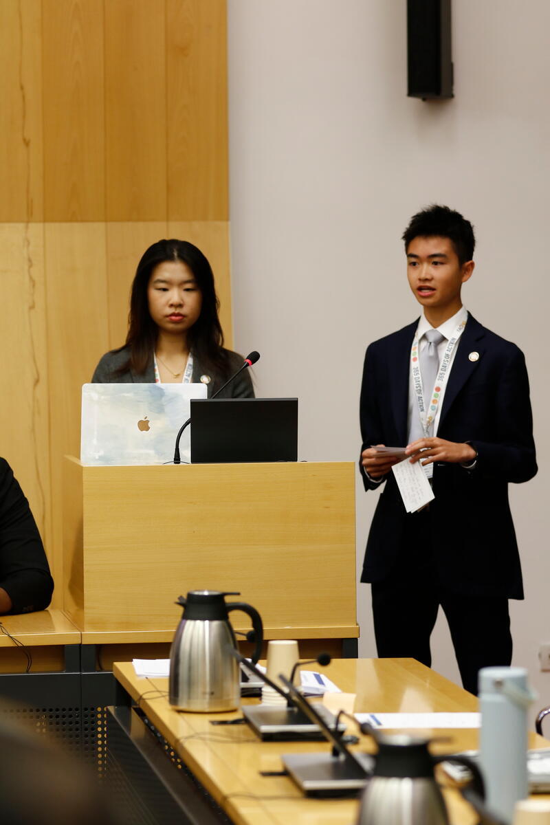 Furuiyi (Rae) Liu and Maxwell Shu Wang Yau, representatives for KIDsforSDGs, give their speech during the AgX Fair Finals.
