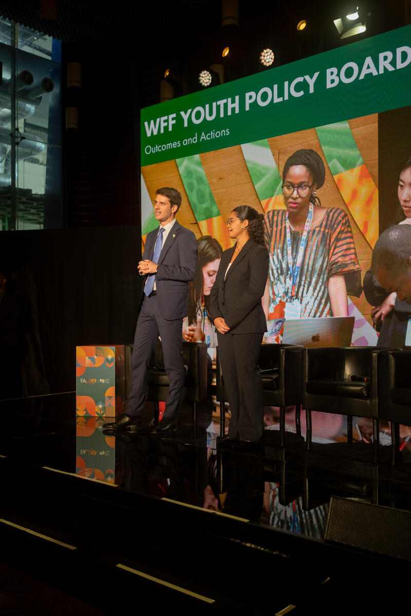 14 October 2025. FAO Headquarters, Rome, Italy. Andrea Granata (on the left) and Zineb Amine (on the right) moderate the event From Policy to Action: Youth shaping global agrifood systems