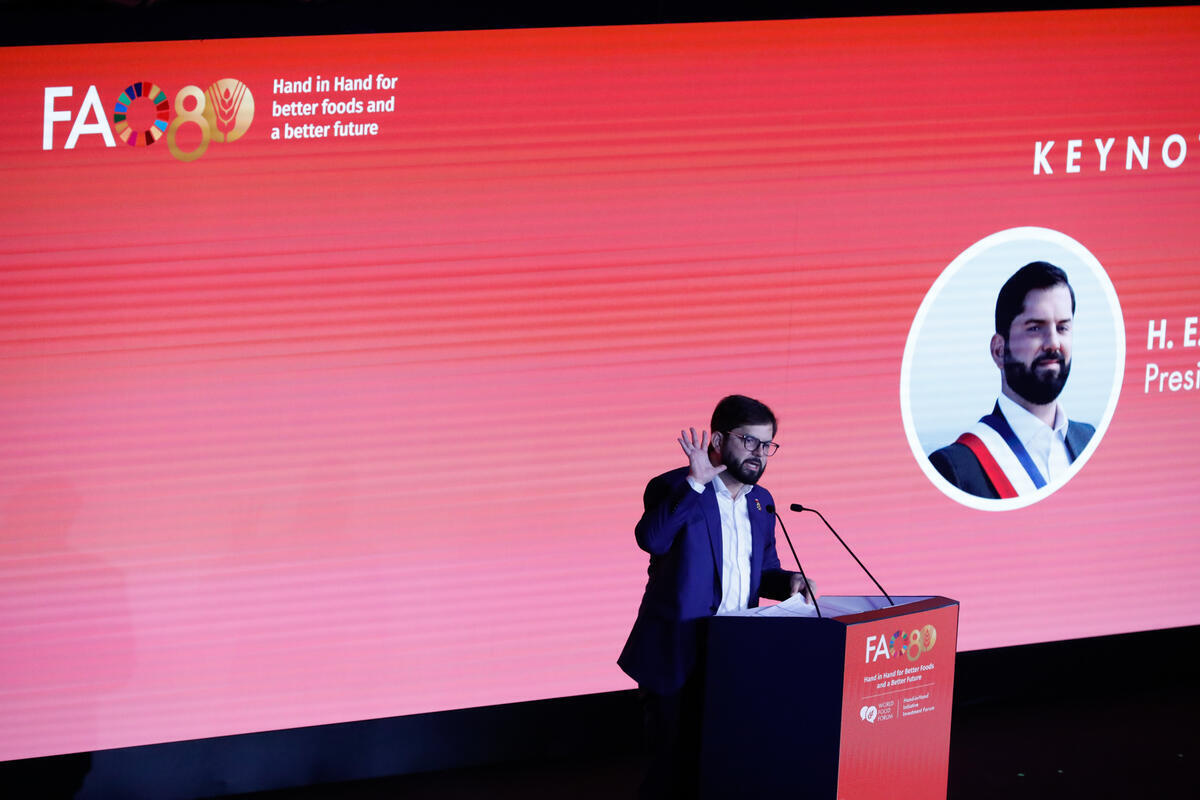 14 October 2025. FAO Headquarters, Rome, Italy. His Excellency Gabriel Boric Font, President of the Republic of Chile, delivers a speech at the Hand-in-Hand Initiative Investment Forum Opening, held during the World Food Forum 2025.