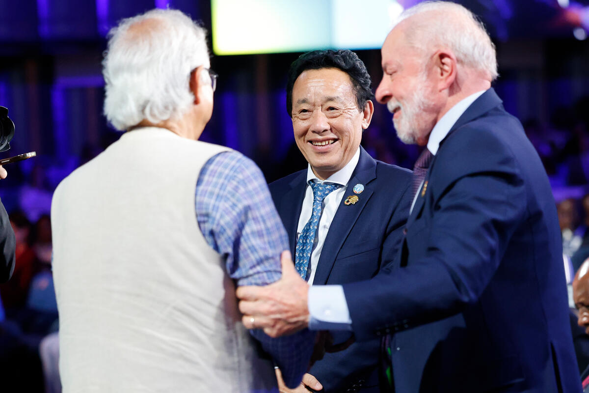 13 October 2025, Rome, Italy. FAO Director-General QU Dongyu, (C) next to Luiz Inácio Lula da Silva, President of Brazil. smiles at Muhammad Yunus, Chief Adviser of the interim Government of the People’s Republic of Bangladesh, during the World Food Forum (WFF) 2025 Grand Opening. The fifth edition of the World Food Forum (WFF), the largest annual gathering of agrifood systems stakeholders globally, runs at FAO headquarters in Rome from 10 to 17 October 2025. FAO Headquarters (Plenary Hall).