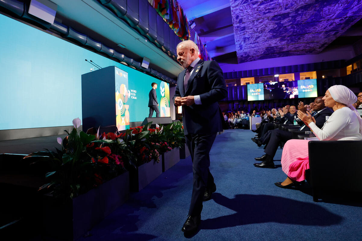 13 October 2025, Rome, Italy. Luiz Inácio Lula da Silva, President of Brazil, walks to the podium to deliver his address during the World Food Forum (WFF) 2025 Grand Opening. The fifth edition of the World Food Forum (WFF), the largest annual gathering of agrifood systems stakeholders globally, runs at FAO headquarters in Rome from 10 to 17 October 2025. FAO Headquarters (Plenary Hall).