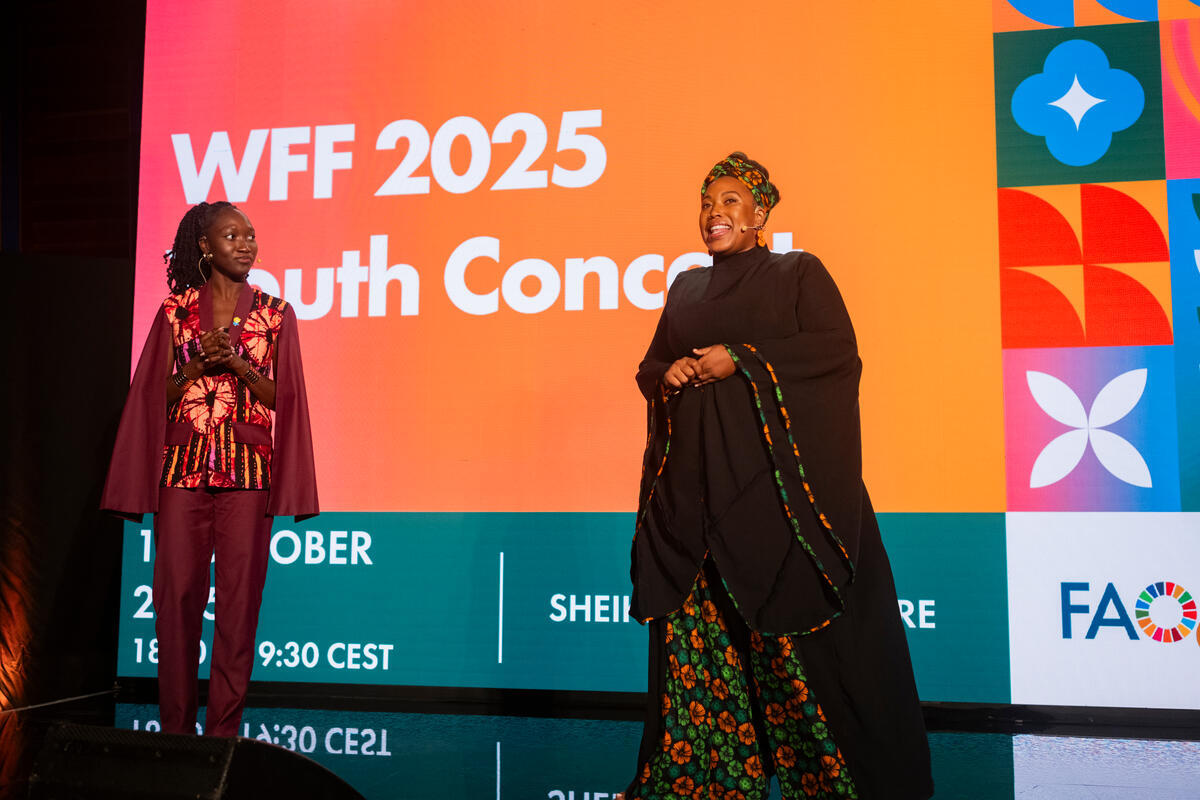 13 October 2025. FAO Headquarters, Rome, Italy. From left to right: Mariatou Sarr, member of the WFF Global Youth Action Initiative within the Youth Culture Programme, and Dr Rachel V. Brown, Executive Director and Co-Founder of the Every Mikkle Foundation and WFF Champion, host the Youth Concert of the World Food Forum 2025.