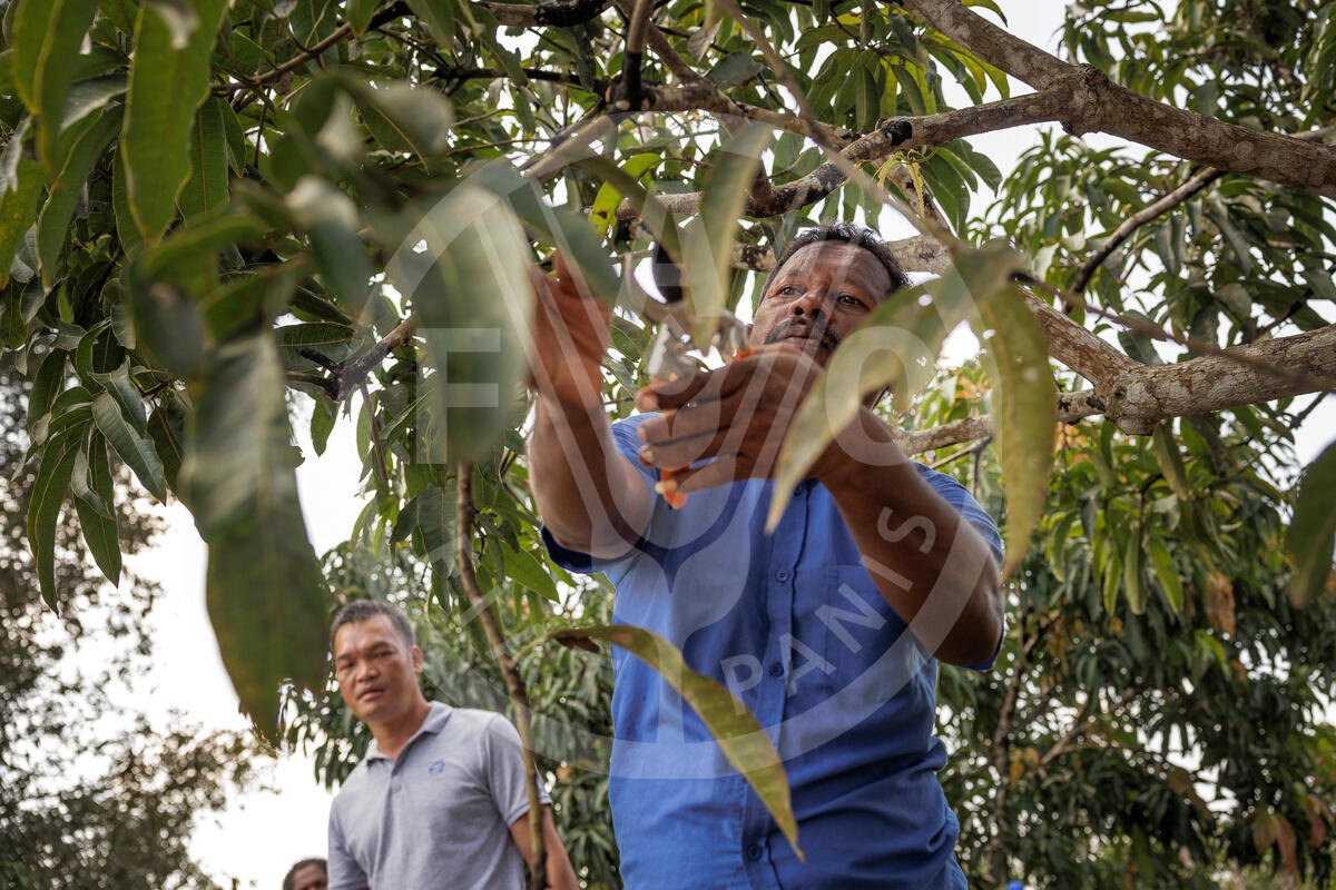20 February 2025. Nochchiyagama, Sri Lanka. LSM Dissanayake, a mango farmer, prunes one of his trees, under the supervision of Zengxian Zhao, a Chinese expert advisor on crop cultivation. Dissanayake is receiving Chinese agricultural expertise and technological support to improve his harvests.