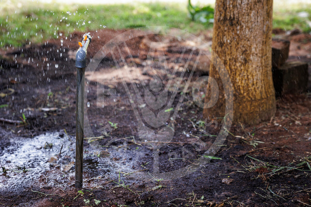 SRI LANKA, 2025. Water from irrigation system across growing mangoes