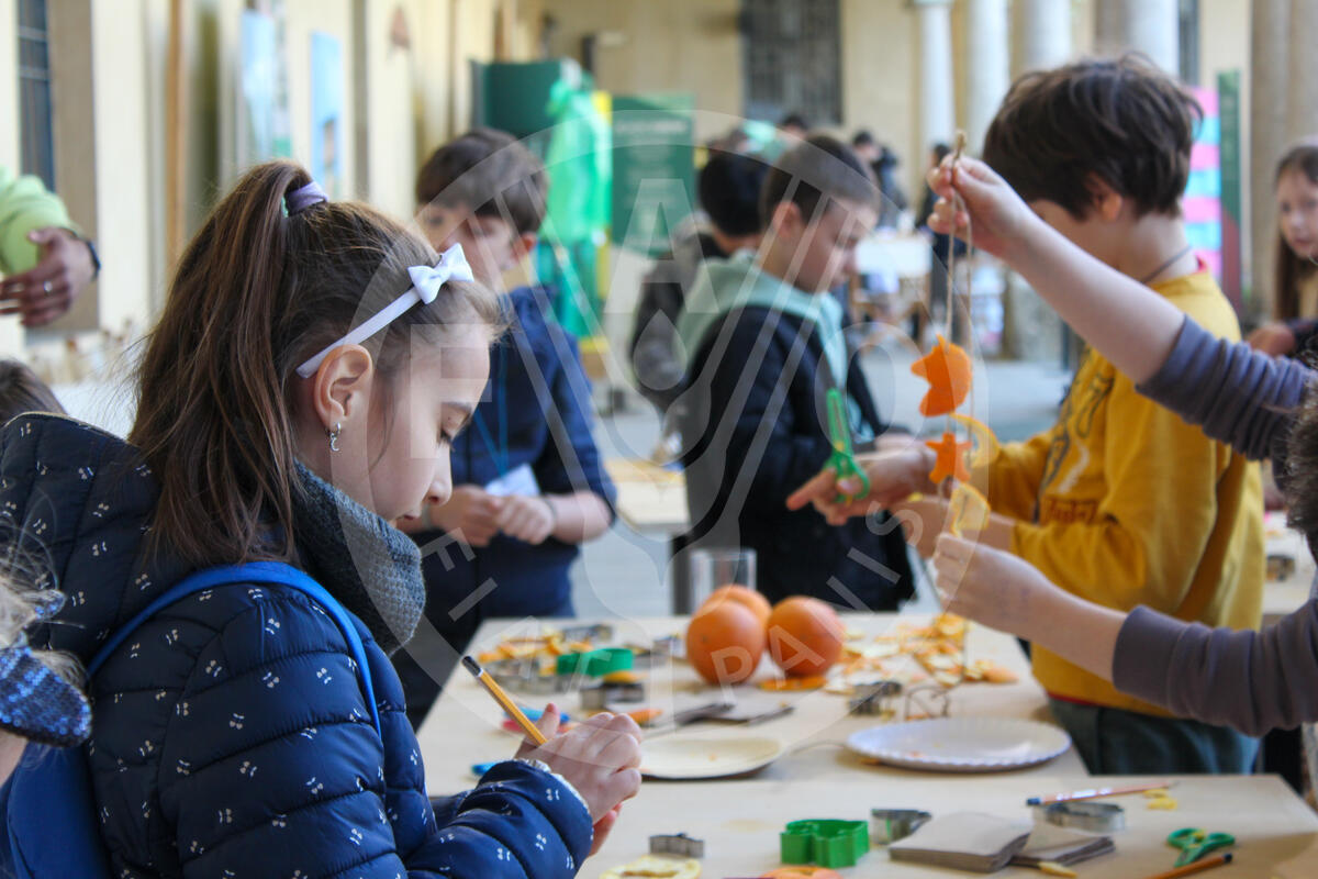 Milan, Italy. As part of FAO’s participation in Vanity Fair Italia’s Giardino delle Idee during Milan Design Week 2025, primary school children were invited to reflect on sustainability through creative, hands-on activities. “Peels of art”, an anti-waste workshop, showed how food scraps—like orange peels—can be reused creatively, turning waste into art.