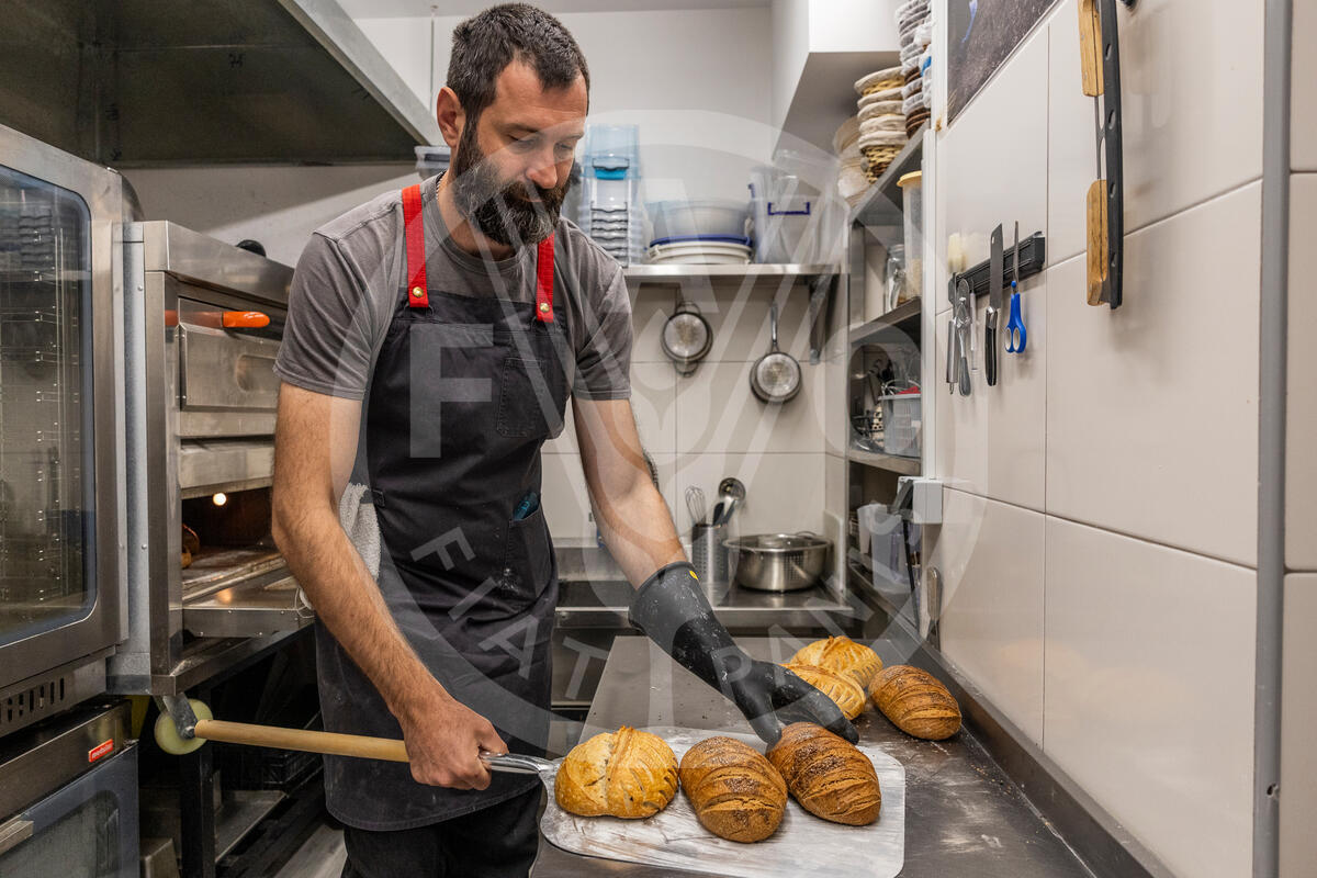 May 2025, Tbilisi, Georgia — Farmer and baker Shota Lagazidze takes bread out of the oven in his bakery, Tbislisi, Georgia. Shota is supported by the Benefit-sharing Fund, the operational mechanism of the International Treaty on Plant Genetic Resources for Food and Agriculture (ITPGRFA), which facilitates international cooperation on plant genetic resources.