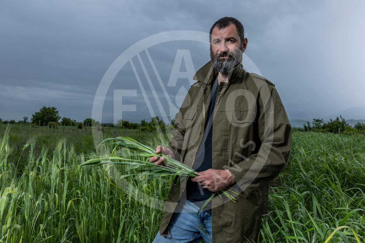 May 2025, Zemo Alvani, Georgia — Farmer Shota Lagazidze works in a wheat field in his Zemo Alvani farm, Georgia. Shota is supported by the Benefit-sharing Fund, the operational mechanism of the International Treaty on Plant Genetic Resources for Food and Agriculture (ITPGRFA), which facilitates international cooperation on plant genetic resources.