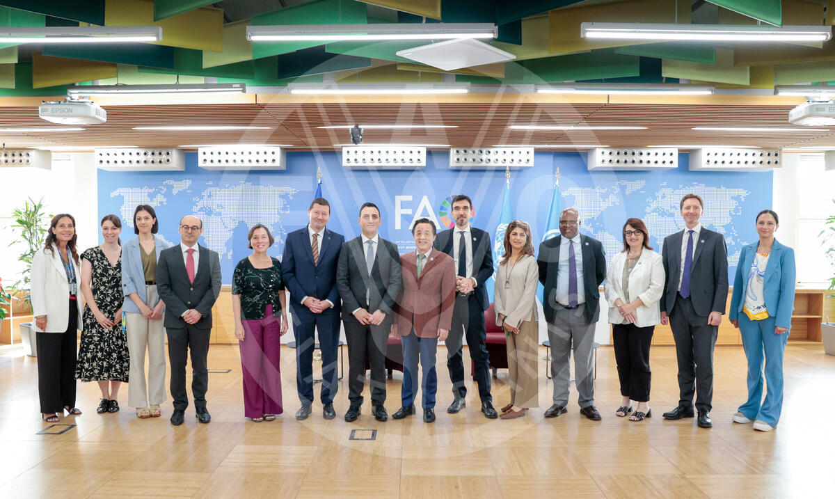 11 July 2025, Rome, Italy. Group photo at the end of FAO Director-General QU Dongyu meeting with EU Commissioner for Intergenerational Fairness, Youth, Culture and Sport, Glenn Micallef. FAO Headquarters (Iraq Room).