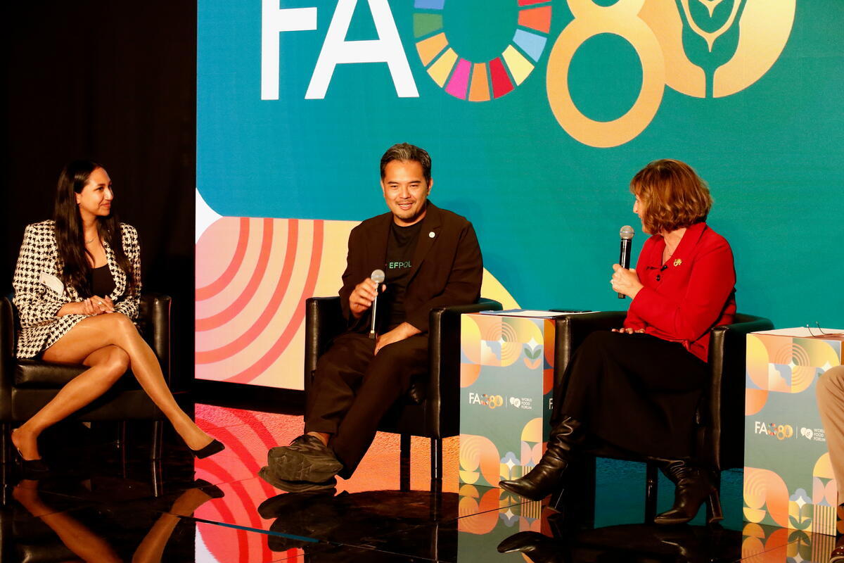 15 October 2025, FAO Rome Headquarters, Italy. Beth Bechdol (R) FAO Deputy Director-General, Kunihiro Shimoji (C) and Miraal Kabir (L) discuss during the Private Sector Roundtable.