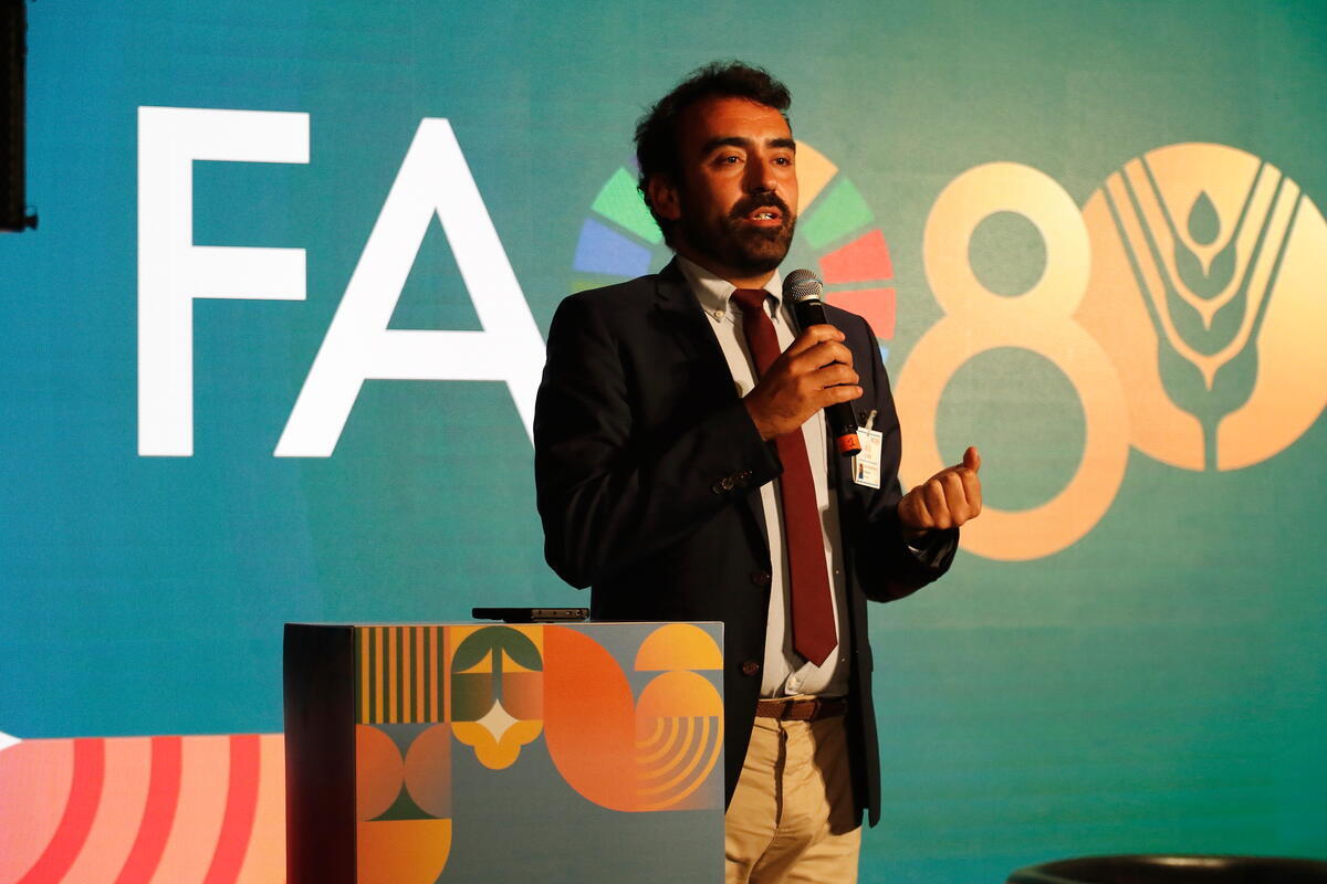15 October 2025, FAO Rome Headquarters, Italy. Pablo Santaeufemia, CEO of Bridge for Billions, addresses his keynote speech at the Private Sector Roundtable.