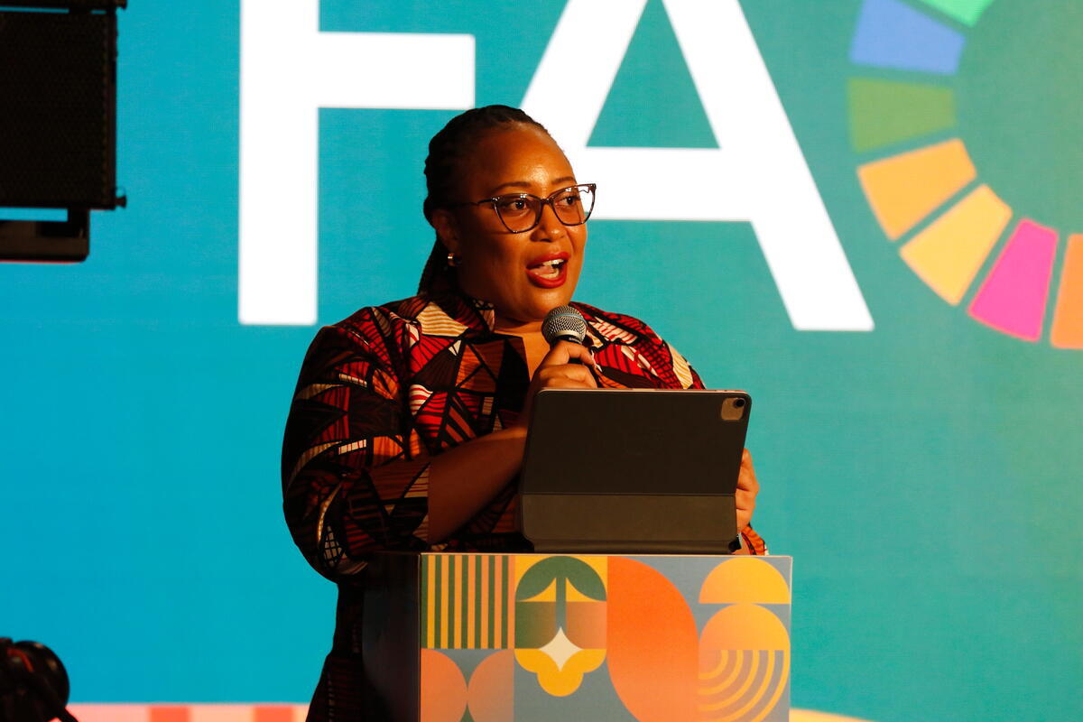 15 October 2025, FAO Rome Headquarters, Italy. Grace Wachori, Regional Director for Africa at the Aspen Network of Development Entrepreneurs (ANDE), delivers her opening remarks at the Private Sector Roundtable.